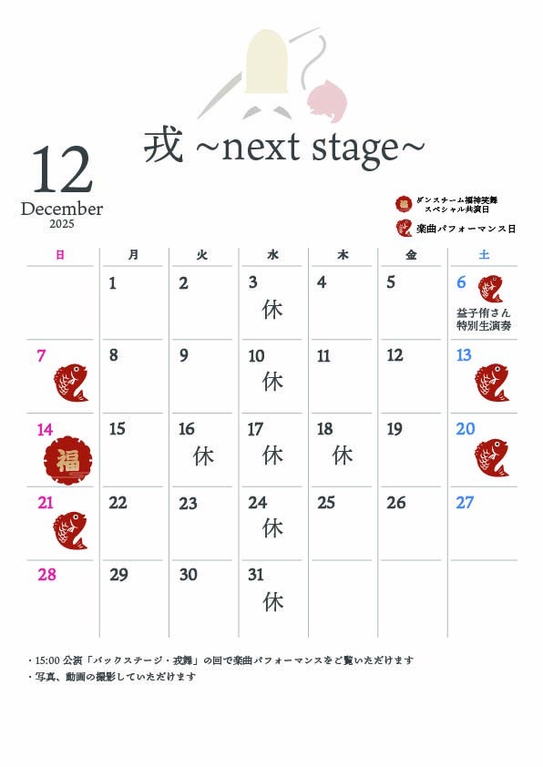 12月7日15:00(バックステージ&戎舞)の公演につきまして、満席となりましたため、ご予約していただくことができません。ご了承ください。 なお、その他日程の公演のお座席に関しましては、ご予約を受け付けておりますので、皆様のご来場をお待ち... -